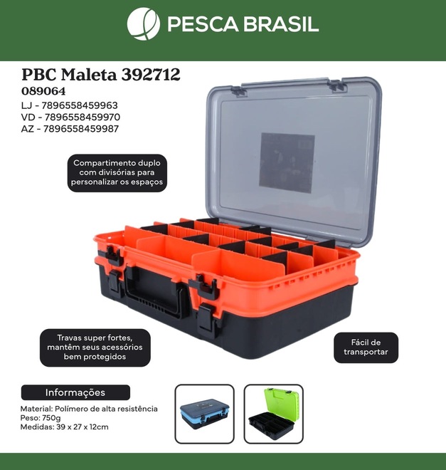 A Maleta Pesca Brasil 392712 é ideal para quem busca organização e praticidade na hora de armazenar equipamentos, ferramentas ou acessórios. Perfeita para pescadores, profissionais e entusiastas.Ficha Técnica Marca: Pesca Brasil Modelo: 392712 Medidas: 39 x 27 x 12 cm Material: Polímero resistente Peso: 750 g Compartimentos: Duplo com divisórias internas Fechamento: Duas travas de segurança Garantia: 6 mesesDestaques e Diferenciais Compartimento duplo para melhor organização Estrutura leve e resistente, ideal para transporte Duas travas que garantem mais segurança Design funcional para pesca, ferramentas e hobbies Excelente custo-benefício com alta durabilidadePerguntas Frequentes (FAQ)1. A maleta é resistente à água?Não é 100% à prova d’água, mas protege contra respingos leves.2. Posso usar para guardar ferramentas?Sim! Ideal para pesca, ferramentas, eletrônicos e muito mais.3. Tem divisórias removíveis?Não. As divisórias são fixas para maior firmeza.O que vem na embalagem 1 Maleta Pesca Brasil 392712Organize, proteja e transporte seus itens com a resistência e praticidade da Maleta Pesca Brasil 392712!