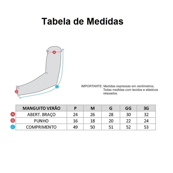 - Tamanho GG: Bíceps (30 cm), punho (22 cm), comprimento (52 cm)