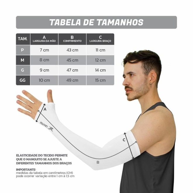 Manguito Longo Elástico Basic HC FPS UV50+ - Kit com 3 DESEMPENHO E CONFORTO: O Manguito Elástico Basic HC da Muvin foi desenvolvido com material específico para proporcionar desempenho na prática de atividades esportivas como ciclismo, corrida, vôlei, basquete, futebol, entre outras TECNOLOGIA DRY: Possui uma tecnologia que absorve o suor e facilita sua evaporação. Por conta dessa boa respirabilidade do tecido, evita o odor e proporciona mais conforto ao praticar as atividades físicas PROTEÇÃO SOLAR: Possui o diferencial de contar com FPS UV 50+ nos braços até as mãos, sendo por conta disso uma ótima opção de uso para atividades ao ar livre, garantindo segurança e proteção contra a atuação dos raios solares ÓTIMO AJUSTE: Possui ótimo ajuste, com elastano na medida certa para se ajustar ao corpo e não apertar muito. Também possui elástico na barra, o que colabora para um ajuste ideal ao corpo e evita que o manguito desça durante as atividades EFEITOS PÓS-EXERCÍCIOS: A compressão da musculatura aumenta o fluxo sanguíneo, o que ocasiona melhor oxigenação e remoção de lactato, responsável pela regeneração muscular. O uso do Manguito trará uma sensação menor de cansaço pós-atividade O Manguito Longo Elástico Basic HC da Muvin foi desenvolvido para proporcionar conforto e melhor desempenho a praticantes de atividades esportivas como corrida, ciclismo, voleibol, basquete, entre outros. Muito utilizado no voleibol, permite que o impacto da bola no braço seja aliviado em momentos específicos do esporte, como no caso da recepção de manchete, por exemplo. Além disso, também tem a função de não permitir que o suor escorra dos braços para a mão, o que proporciona um melhor desempenho em quadra. O tecido possui a tecnologia dry e também tem em sua composição o elastano, sendo uma peça que possui ótima respirabilidade e também ajuste ideal sem apertar o corpo, inclusive com elástico na barra que evita que o manguito desça durante as atividades. Diferente de manguitos tradicionais, o modelo Basic HC da Muvin possui cobertura dos braços até a mão, com uma abertura para prender no dedão, garantindo melhor proteção ao sol, pois conta com FPS UV 50+, sendo assim uma ótima opção de uso para atividades ao ar livre, garantindo segurança e proteção contra a atuação dos raios solares. Além disso, possui logo refletivo em ambos os braços para prevenção de acidentes em atividades noturnas. O manguito também comprime os músculos do braço, e por conta disso, diminui a vibração dos mesmos durante a prática esportiva, o que reduz a sensação de cansaço e, consequentemente, aumenta o desempenho muscular. E os benefícios não se limitam apenas ao momento da atividade, já que os efeitos pós-exercício também podem ser notados. Isso porque a compressão muscular oferecida pelo manguito aumenta o fluxo sanguíneo, o que proporciona melhor oxigenação e remoção de lactato, responsável pela regeneração muscular. Garantia contra defeito de fabricação de três meses. Mediante apresentação de nota fiscal.ref: M0ZNBL