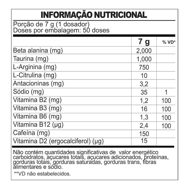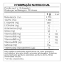 Beta alanina, taurina, L-arginina, extrato de laranja moro (Citrus sinensis L. Osbeck), citarg (alga chondrus crispus invernal), pre mix de vitaminas do complexo B (ácido nicotínico, piridoxina, riboflavina, cianocobalamina), pó de cogumelo (agaricus bisponus), acidulante ácido cítrico, aroma idêntico ao natural de melancia, edulcorante sucralose, ciclamato de sódio, acessulfame de potássio e sacarina sódica, antiumectante dióxido de silício, corante artificial vermelho 40 ALÉGICOS: CONTÉM DERVADOS DO LEITE E SOJA.