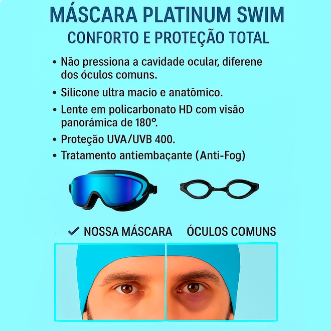 • A ventosa em silicone ultra confort 3D se encaixa perfeitamente e confortável e evita a entrada de água com toque suave no seu rosto