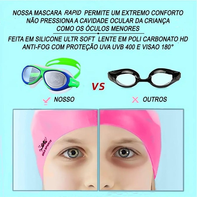 2. Campo extra largo de visão: Nossa máscara de natação Gold Sports Infanto-Juvenil são projetados com lentes mais largas e possuem campo de visão de 180 graus. Proporciona máximo campo de visão e clareza para garantir seu filho tem uma experiência de natação mais confortável.