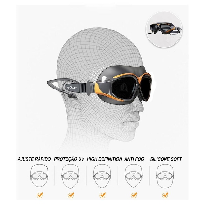 A Máscara De Natação Gold Sports Vulcan 7.0 High Definition Adulto Característica 1. Moldura de cloreto de polivinilo com revestimento resistente a impacto. 2. Campo extra largo de visão: Nossa Mascara De Natação Gold Sports Vulcan 7.0 High Definition são projetados com lentes mais largas e possuem campo de visão de 180 graus. Proporciona máximo campo de visão e clareza para garantir seu filho tem uma experiência de natação mais confortável. 3. Design funcional: O novo botão de ajuste das tiras facilita o ajuste. O frame se encaixa perfeitamente, e o design mais largo distribui a pressão de forma mais uniforme, dando uma experiência de uso confortável. 4. Proteção anti embaçante e UVA e UVB400: Nossa Máscara De Natação Gold Sports Vulcan 7.0 High Definition Adulto são equipados com lentes de poli carbonato resistente a impacto. Todas as lentes proporcionam proteção anti - embaçante e anti-UVa e UVB400, que podem proteger seus olhos dos danos dos raios UV e proporcionar a melhor visão. 5. Os materiais mais seguros: Nossa máscara de natação é feito de silicone inodoro, hipoalergênico. O gascket da Máscara de natação possui Design 3D ergonômico encaixa perfeitamente na cavidade ocular de Adultos ou Adolescentes e seu silicone e ultra soft  e anti alérgico. Possui em sua tiras protetores de ouvido permitindo que não entre água no ouvido, se desejar pode cortado da tira.