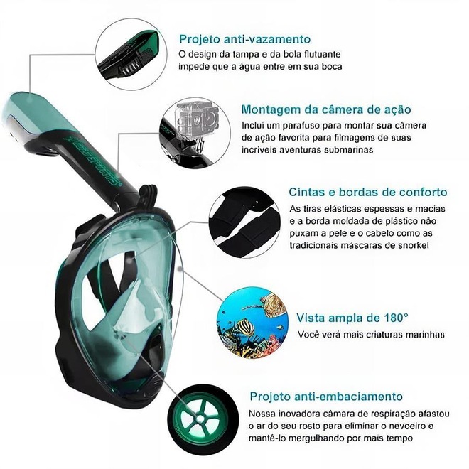 Nossa Máscara Subaquática de Mergulho Full Face Gold Sports Com Snorkel é muito mais longo do que a versão antiga, por isso é mais fácil de desmontar e respiração mais suave.Nosso suporte de câmera de máscara de snorkel é ajustável e móvel, você pode liberar para ajustar a altura. Enquanto o suporte da câmera da versão antiga é corrigido lá. A máscara de mergulho é feita de silicone líquido, é ambientalmente correta e anti-alérgica. Enquanto antes versão é feita de silicone normal. Nossa máscara quando você mergulha a válvula fecha automaticamente sem deixar entrar a água. Respirando naturalmente, a máscara de snorkel facial é muito mais fácil de usar do que a tradicional com o tubo bucal. Maior Área Visualizando. Máscara full face snorkel deixá-lo tirar mais proveito de suas aventuras subaquáticas. Headband ajustável do tecido elástico, fácil de usar e adequado para todos os tipos de forma da cabeça. Mais fácil do que nunca respirar confortavelmente pela boca ou nariz enquanto você está mergulhando Design de fluxo de ar duplo, respirando mais suavemente, qualquer pessoa que não queira respirar suavemente ao mergulhar.