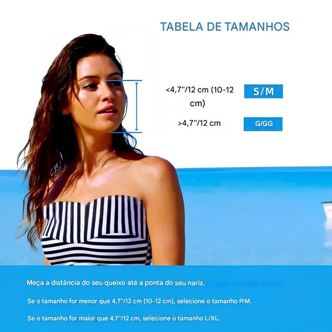 O rosto de todos é diferente, então o tamanho adulto da máscara de snorkel é importante para acertar. O tamanho é medido do nariz até a parte inferior do queixo. se menor ou igual a 4,72 pol (12cm), selecione o tamanho S/M. Se tiver mais de 4,72 pol (12cm), selecione o tamanho L/XL.