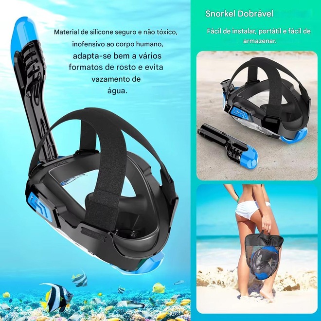 A máscara de snorkel envolta em silicone macio e seguro também é adequada para pessoas altamente alérgicas. Veda muito bem o rosto, tem boa estanqueidade e não vaza água, e a alça ajustável ajuda a ajustá-lo confortavelmente, o que é adequado para a maioria dos tipos de rostos.