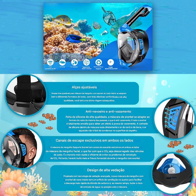 Nós nos concentramos na segurança do mergulho com snorkel. A máscara de snorkel facial completa possui 3 canais de ar completamente separados - entrada de ar intermediária, dois canais de exaustão exclusivos em ambos os lados. Para fazer com que a expiração e a inalação sejam completamente isoladas para evitar a mistura de gases de escape e ar fresco. O aparelho respiratório lateral permite a exalação que alivia a pressão na máscara durante o mergulho.