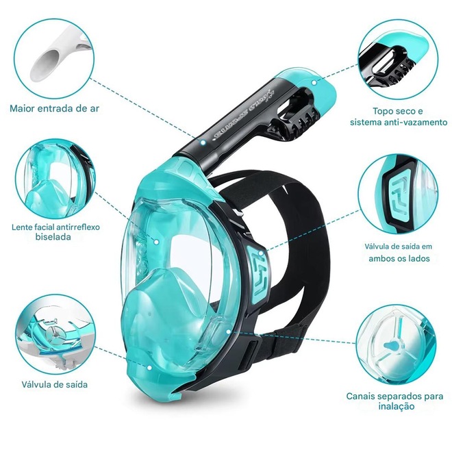Nós nos concentramos na segurança do mergulho com snorkel. A máscara de snorkel facial completa possui 3 canais de ar completamente separados - entrada de ar intermediária, dois canais de exaustão exclusivos em ambos os lados. Para fazer com que a expiração e a inalação sejam completamente isoladas para evitar a mistura de gases de escape e ar fresco. O aparelho respiratório lateral permite a exalação que alivia a pressão na máscara durante o mergulho.