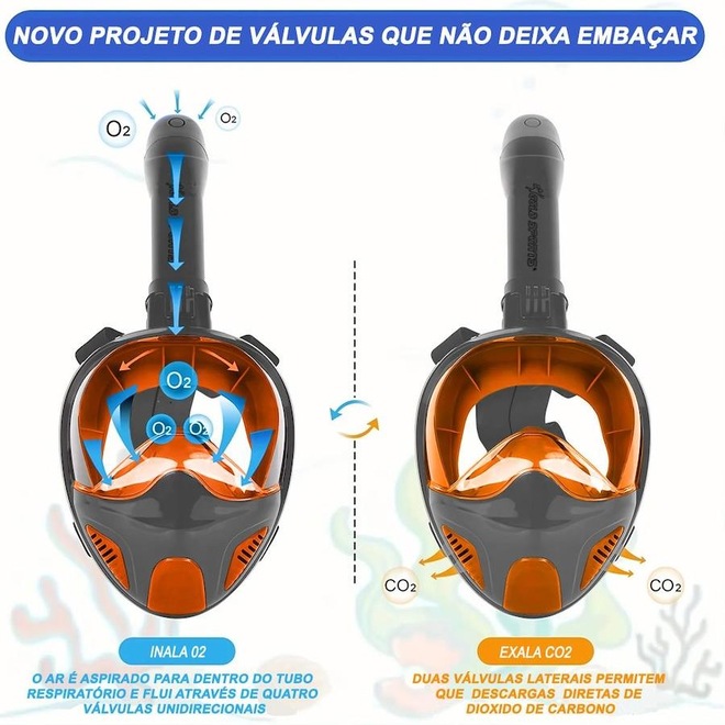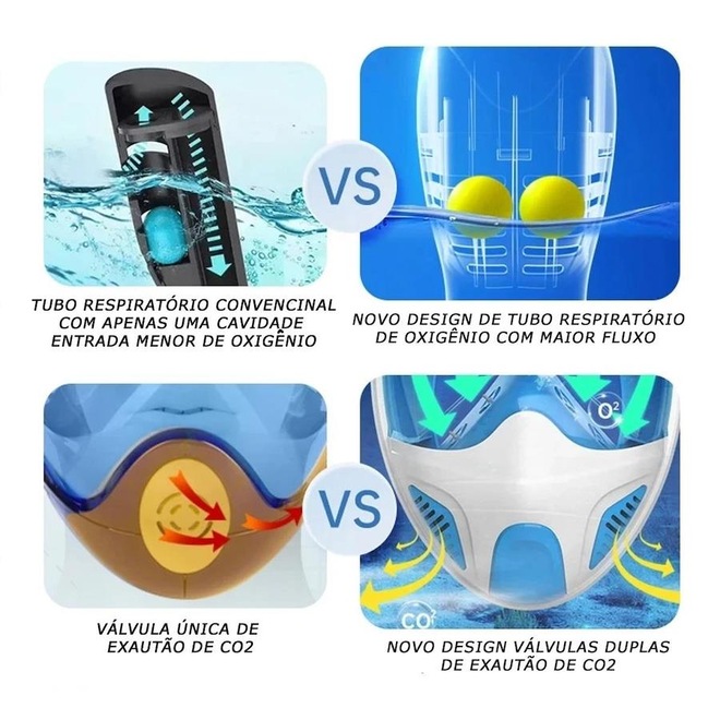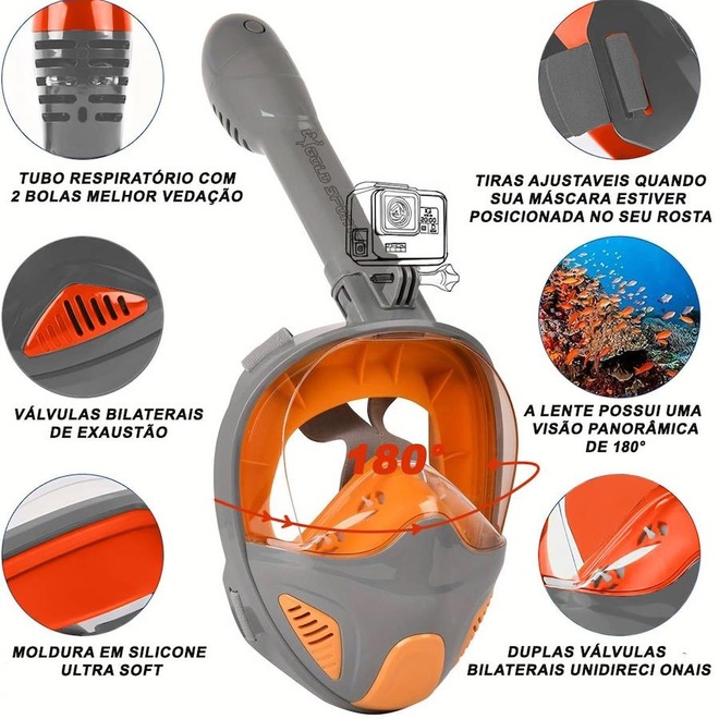 Nossa Mascara Subaquática de de Mergulho Gold Sports New Full Face Com Snorkel é muito mais longo do que a versão antiga, por isso é mais fácil de desmontar e respiração mais suave.Nosso suporte de câmera de máscara de snorkel é ajustável e móvel, você pode liberar para ajustar a altura. Enquanto o suporte da câmera da versão antiga é corrigido lá. A máscara de mergulho é feita de silicone líquido, é ambientalmente correta e anti-alérgica. Enquanto antes versão é feita de silicone normal. Nossa máscara quando você mergulha a válvula fecha automaticamente sem deixar entrar a água. Respirando naturalmente, a máscara de snorkel facial é muito mais fácil de usar do que a tradicional com o tubo respiratório com dupla entrada e 2 bolas de vedação quando submersa. Sua lente panoramica posui uma area de  de 180 graus de visulaização. A Máscara full face snorkel deixá-lo tirar mais proveito de suas aventuras subaquáticas. Headband ajustável do tecido elástico, fácil de usar e adequado para todos os tipos de forma da cabeça. Mais fácil do que nunca respirar confortavelmente pela boca ou nariz enquanto você está mergulhando Design de fluxo de ar duplo, respirando mais suavemente, qualquer pessoa que não queira respirar suavemente ao mergulhar. Possui um novo sistema de dupla válvulas bilaterais e unidirecional de exalarco2 tornando sua lente anti-embaçante.