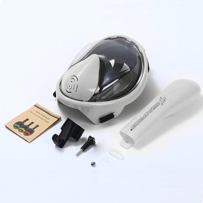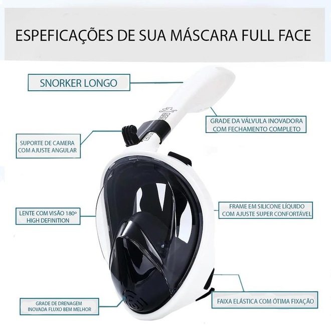 Nossa Máscara Subaquática de Mergulho Full Face Gold Sports Racer Com Snorkel é muito mais longo do que a versão antiga, por isso é mais fácil de desmontar e respiração mais suave.Nosso suporte de câmera de máscara de snorkel é ajustável e móvel, você pode liberar para ajustar a altura. Enquanto o suporte da câmera da versão antiga é corrigido lá. A máscara de mergulho é feita de silicone líquido, é ambientalmente correta e anti-alérgica. Enquanto antes versão é feita de silicone normal. Nossa máscara quando você mergulha a válvula fecha automaticamente sem deixar entrar a água. Respirando naturalmente, a máscara de snorkel facial é muito mais fácil de usar do que a tradicional com o tubo bucal. Maior Área Visualizando. Máscara full face snorkel deixá-lo tirar mais proveito de suas aventuras subaquáticas. Headband ajustável do tecido elástico, fácil de usar e adequado para todos os tipos de forma da cabeça. Mais fácil do que nunca respirar confortavelmente pela boca ou nariz enquanto você está mergulhando Design de fluxo de ar duplo, respirando mais suavemente, qualquer pessoa que não queira respirar suavemente ao mergulhar.