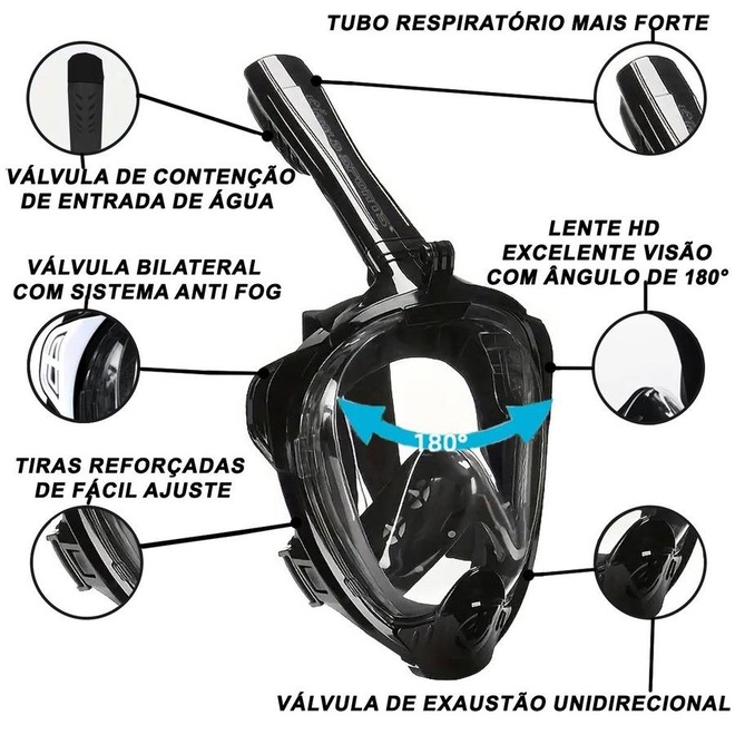 Nossa Mascara Subaquática de de Mergulho Gold Sports Sea Full Face Com Snorkel é muito mais longo do que a versão antiga, por isso é mais fácil de desmontar e respiração mais suave.Nosso suporte de câmera de máscara de snorkel é ajustável e móvel, você pode liberar para ajustar a altura. Enquanto o suporte da câmera da versão antiga é corrigido lá. A máscara de mergulho é feita de silicone líquido, é ambientalmente correta e anti-alérgica. Enquanto antes versão é feita de silicone normal. Nossa máscara quando você mergulha a válvula fecha automaticamente sem deixar entrar a água. Respirando naturalmente, a máscara de snorkel facial é muito mais fácil de usar do que a tradicional com o tubo respiratório com dupla entrada e 2 bolas de vedação quando submersa. Sua lente panoramica posui uma area de de 180 graus de visulaização. A Máscara full face snorkel deixá-lo tirar mais proveito de suas aventuras subaquáticas. Headband ajustável do tecido elástico, fácil de usar e adequado para todos os tipos de forma da cabeça. Mais fácil do que nunca respirar confortavelmente pela boca ou nariz enquanto você está mergulhando Design de fluxo de ar duplo, respirando mais suavemente, qualquer pessoa que não queira respirar suavemente ao mergulhar. Possui um novo sistema de dupla válvulas bilaterais e unidirecional de exalar co2 tornando sua lente anti-embaçante.