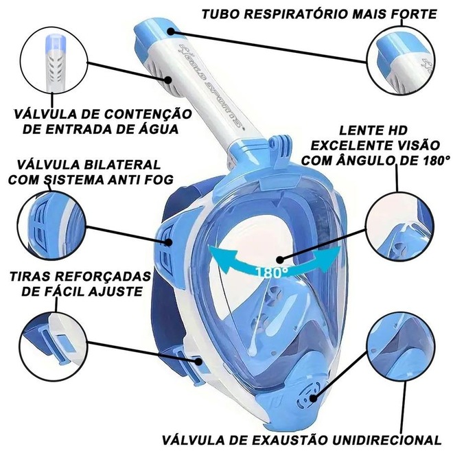 Nossa Mascara Subaquática de de Mergulho Gold Sports Sea Full Face Com Snorkel é muito mais longo do que a versão antiga, por isso é mais fácil de desmontar e respiração mais suave.Nosso suporte de câmera de máscara de snorkel é ajustável e móvel, você pode liberar para ajustar a altura. Enquanto o suporte da câmera da versão antiga é corrigido lá. A máscara de mergulho é feita de silicone líquido, é ambientalmente correta e anti-alérgica. Enquanto antes versão é feita de silicone normal. Nossa máscara quando você mergulha a válvula fecha automaticamente sem deixar entrar a água. Respirando naturalmente, a máscara de snorkel facial é muito mais fácil de usar do que a tradicional com o tubo respiratório com dupla entrada e 2 bolas de vedação quando submersa. Sua lente panoramica posui uma area de de 180 graus de visulaização. A Máscara full face snorkel deixá-lo tirar mais proveito de suas aventuras subaquáticas. Headband ajustável do tecido elástico, fácil de usar e adequado para todos os tipos de forma da cabeça. Mais fácil do que nunca respirar confortavelmente pela boca ou nariz enquanto você está mergulhando Design de fluxo de ar duplo, respirando mais suavemente, qualquer pessoa que não queira respirar suavemente ao mergulhar. Possui um novo sistema de dupla válvulas bilaterais e unidirecional de exalar co2 tornando sua lente anti-embaçante.