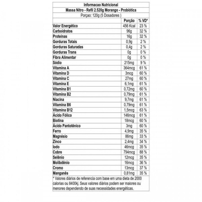 Massa Nitro Probiótica - Morango - Refil 2,5KgMASSA NITRO da Probiótica é um suplemento especialmente desenvolvido com uma combinac#807 a#771 o de protei#769 nas concentrada e isolada do soro do leite, clara de ovo (albumina), protei#769 na isolada de soja e caseinato, resultando em um perfil de aminoa#769 cidos de elevada digestibilidade.MASSA NITRO tambe#769 m conta com diversos carboidratos na composic#807 a#771 o contribuindo para manutenc#807 a#771 o dos ni#769 veis energia constantes ale#769 m de vitaminas e minerais, que garantem, na porc#807 a#771 o dia#769 ria de 360g (3 shakes), 100% da ingesta#771 o dia#769 ria recomendada.