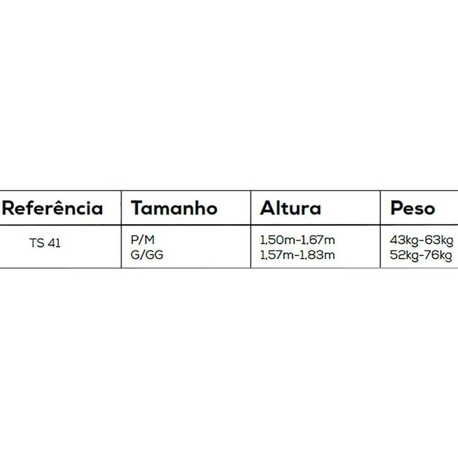 G/GG: Altura - 1,60 m a 1,70 m / Peso - 57 kg a 70 kg.