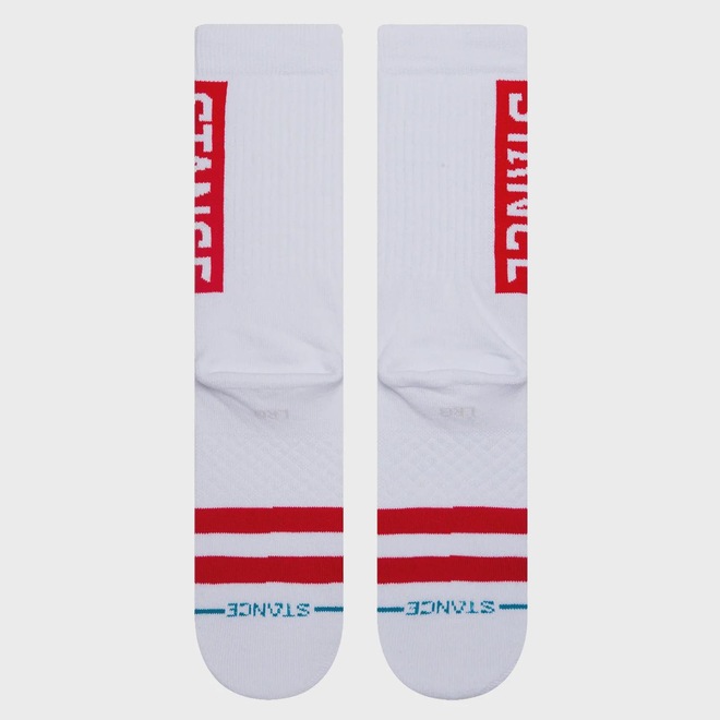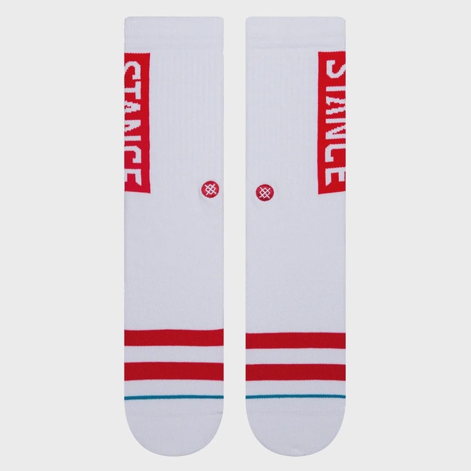 A Meia Stance OG White Red é um modelo de cano alto, fabricada com tecido macio e elástico que se molda ao pé para conforto durante todo o dia.