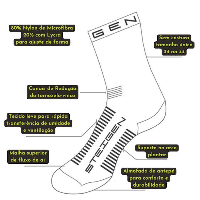 Modelo: Meia Steigen Cano Médio- Midnight Blue Comprimento: Cano Médio ( 1/2 ) As meias esportivas Steigen são Anti-bolhas e garantem conforto e rendimento para a sua corrida. Foram desenvolvidas na Austrália especialmente para a prática de esportes e corrida. Possuem uma tecnologia especial que garante que seu tecido não retenha umidade e matém seus pés secos o tempo todo! Feito por atletas, para atletas! Característica: • Almofada no antepé para conforto e durabilidade • Tecido Leve para rápida tranferência de humidade e respirabilidade • Nylon microfibra (80%) com Lycra (20%) para Ajuste perfeito • Malha Superior de fluxo de ar • Sem costura • Suporte no arco Plantar • 100% livre de bolhas • Tamanho único: 33 ao 44 Não fazem dobras e vincos no tornozelos devido aos detalhes especiais no tecido. As cores e desenhos deixam as meias ainda mais bonitas. Garantia do Fornecedor: 3 Meses Conteúdo da embalagem: • 01 Meia Steigen Cuidados e conservação: Por ser uma meia esportiva, principalmente de corrida, recomendamos ter cuidado na higienização da sua meia Steigen. Dessa forma, você conseguirá tê-la por muito mais tempo em seus treinos. - Procure lavar em água fria com sabão Neutro. - Não use Alvejante. - Mantenha em espaço com boa ventilação e longe da umidade. - Evite lavar com roupas ásperas ou com zíperes que possam causar atrito. - Evite o uso de amaciante, o mesmo pode diminuir a capacidade de absorção de umidade das meias. Portanto, é melhor evitá-lo. - Cuidado com unhas afiadas, unhas afiadas podem causar desgaste prematuros nas meias. Lembrando que as meias steigen são respiráveis, antiodor e de secagem rápida, tornando-as ideais para atividades esportivas e uso diário. Curtiu? Cresça conosco e alcançe o seu melhor! Compre já!