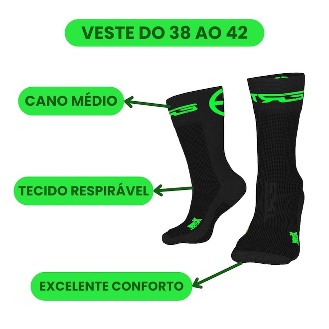 Feita de fio de poliamida, material resistente, leve e muito confortável. Possui telas de respiro na sola e parte superior dos pés, facilitando a troca térmica e evitando que o pé fique muito úmido. Possui tratamento bactericida com íons de prata, que afasta as bactérias, evitando odores indesejáveis.