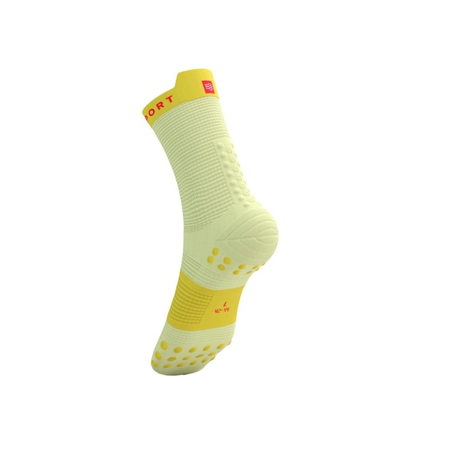Maior conforto, prevenção de bolhas e ventilação ideal em todas as corridas: Para a nova geração do nosso best-seller Pro Racing Socks Run V4.0, pedimos aos corredores da Compressport que nos dissessem exatamente o que eles gostavam, precisavam e queriam. O resultado é uma meia de corrida projetada especificamente para oferecer ventilação ideal e proteção contra bolhas enquanto você corre em direção ao seu próximo RP. O tecido técnico é leve e ventilado, absorvendo rapidamente a umidade para que seus pés permaneçam frescos e secos, mesmo em condições mais quentes. Uma nova biqueira mais larga oferece um ajuste mais ergonômico e propriocepção aprimorada, permitindo que os dedos dos pés se agarrem intuitivamente ao aterrissar para uma passada natural e fluida. Uma malha leve ao redor do tornozelo oferece suporte direcionado quando você acelera o ritmo, enquanto o acolchoamento de tecido felpudo no dedão do pé evita unhas machucadas em corridas mais longas. O suporte de arco médio aumenta a microcirculação e evita que o tecido se torça e dobre, evitando bolhas e irritação. Sobre o tendão de Aquiles, duas linhas de 3D Dots adicionam proteção e suporte, além de uma fileira de novos Flat Dots para maior ventilação. Sob os pés, um padrão de 3D Dots (75%) e Flat Dots (25%) amortece o impacto e oferece maior aderência e ventilação, bem como uma micro estimulação leve, que ajuda a aumentar o retorno venoso e retarda a fadiga à medida que os quilômetros se acumulam. A altura do cano é menor do que os modelos de trilha e bike, com ajuste e tecnologias projetadas especificamente para as demandas de corrida de rua. Uma aba ergonômica na parte de trás da meia adiciona um toque de conforto e estilo.