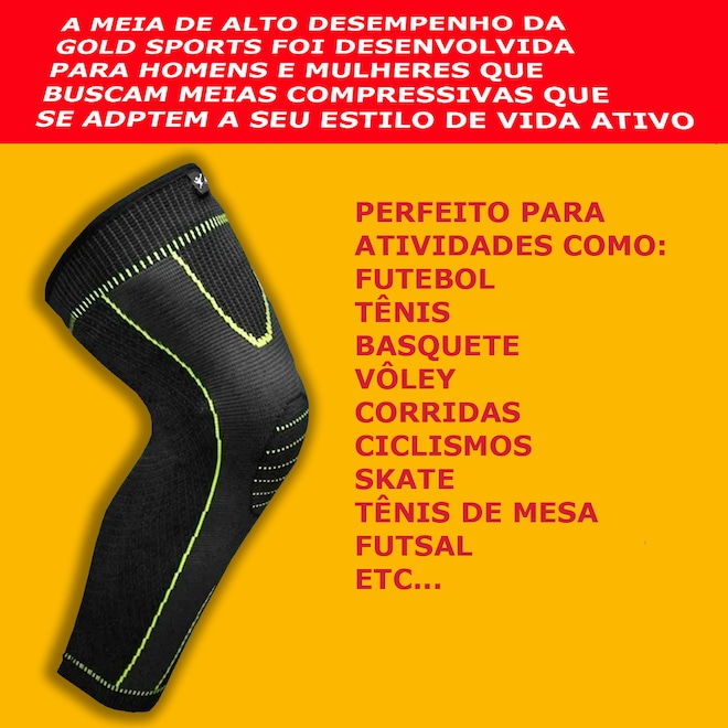 - A meia de compressão da Gold Sports é produzida e, poliamida e elastano, garantindo modelagem anatômica com ajuste perfeito. Para total conforto, conta com a tecnologia dry, que absorve o suor, mantendo a pele seca e arejada.Além disso, traz a tecnologia anti microbial, um tratamento de higiênização que impede a proliferação de bactérias que causam odor. Por fim, traz tecido com acabamento canelado, que se encarrega do ajuste ideal.
