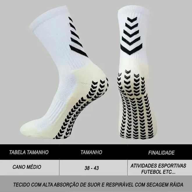 Compressão: Meias que durante a prática esportiva se ajusta automaticamente o tecido reforçado e com projeto anatômico no calcanhar faz com que fique o tempo todo no local correto
