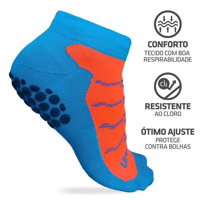 As meias de hidroginástica foram desenvolvidas com material específico para trazer desempenho e conforto aos pés, além de ter maior resistência ao cloro.