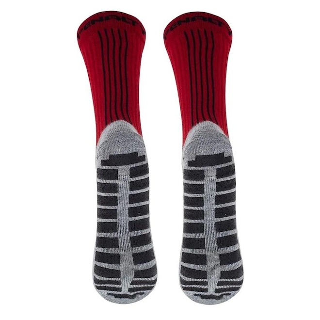 A meia possui solado antiderrapante, fornecendo mais segurança e aderência ao calçado, e tem altura do cano longo, entregando uma proteção extra para a região da canela.