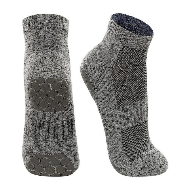 A meia se ajusta aos pés além de ser atoalhada, antiderrapante e com calcanhar verdadeiro.