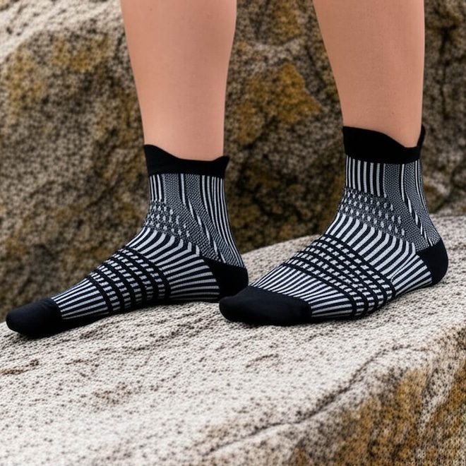 Com suporte de arco plantar, oferece compressão, melhora o conforto, reduz a fadiga e evita que a meia escorregue.
