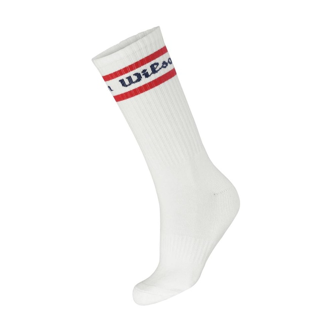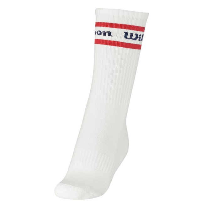 - Detalhamento: Pacote com 1 par de meias na cor branca, que oferecem durabilidade, maciez e conforto. O cano apresenta duas faixas horizontais em cor contrastante, envolvendo a escrita Wilson em destaque. Suave compressão na região do médio pé. Veste do 34 ao 38;