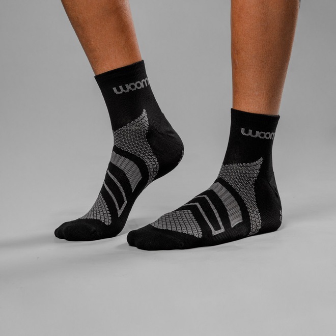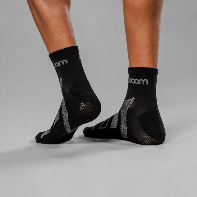 A estrutura das meias Woom sem costura reduz os pontos de atrito e garante conforto extra na prática esportiva.