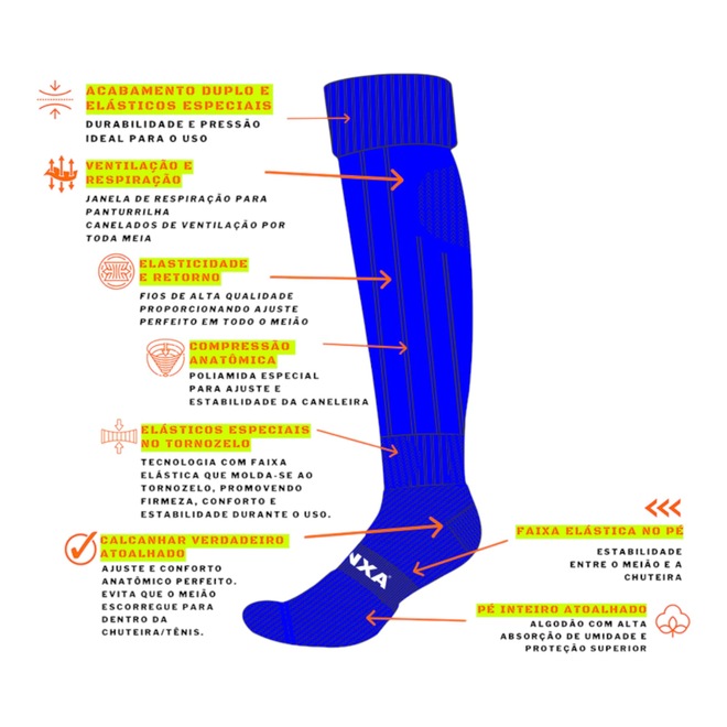 O Meião Kanxa Profissional 1260 é a escolha perfeita para o seu jogo. Com um design anatômico, ele proporciona ajuste e conforto superiores, evitando que escorregue durante a partida. Seu material elástico e durável garante compressão e suporte para os músculos, melhorando a circulação e ajudando a prevenir cãibras. Jogue com mais segurança e confiança, focando apenas na sua performance em campo.