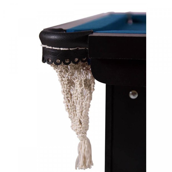 A Mesa de Sinuca Bilhar tem a superfície de jogo de 15mm revestido com tecido acrilico, jogo de caçapas em courvin com redes e acabamento revestido em ébano.