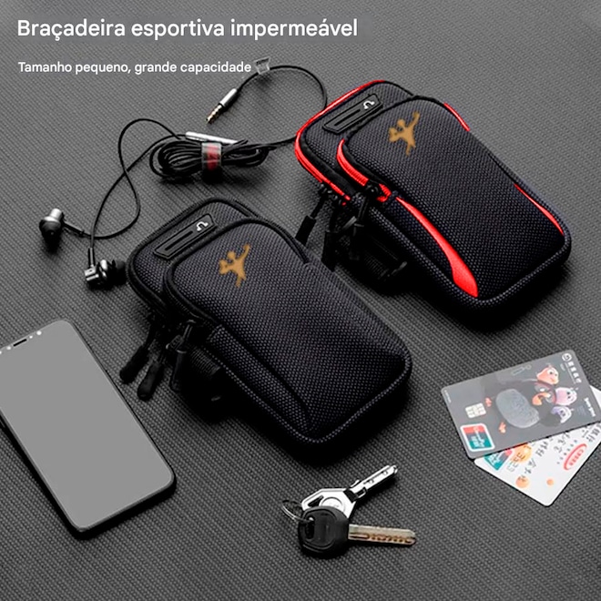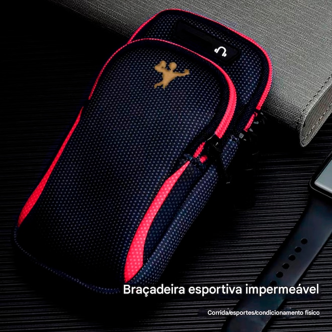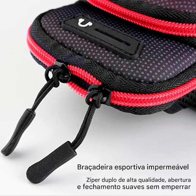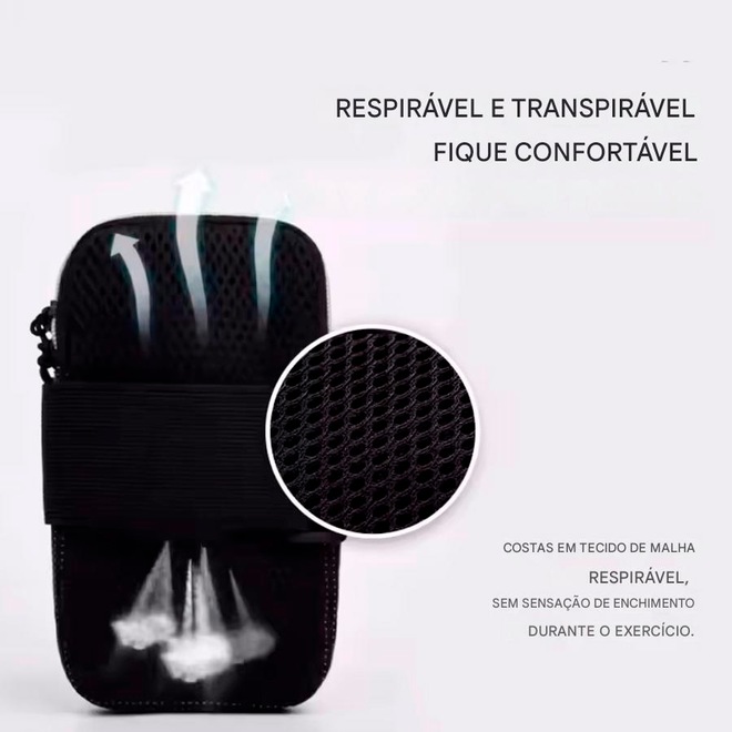 O sistema de fechamento são com fecho de contato e zíper garante que o celular preservado seguro e protegido durante o exercício, evitando quedas e danos ao aparelho. Além disso, uma braçadeira ajustável permite que a bolsa seja adaptada ao tamanho do braço, proporcionando maior conforto e liberdade de movimento.