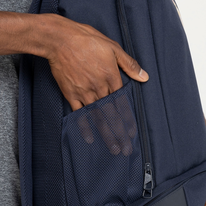Resistente, possui compartimento amplo com divisória para notebook e espaços externos que proporcionam uma organizada distribuição dos itens.