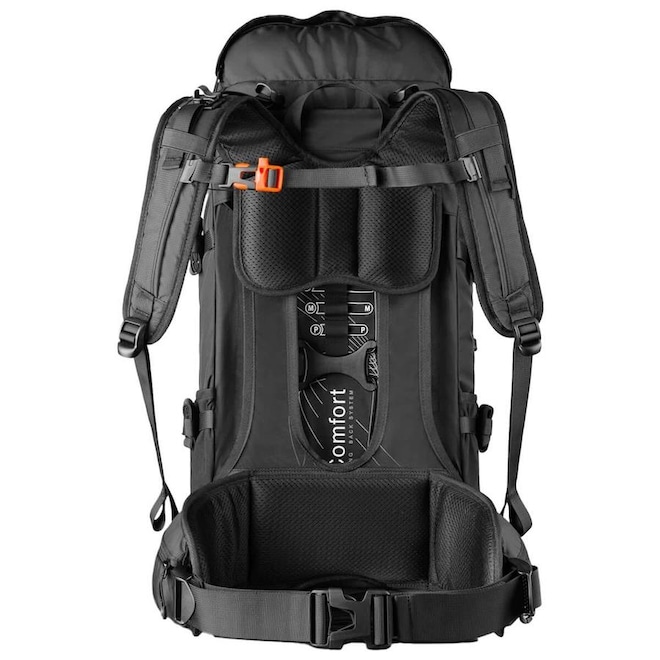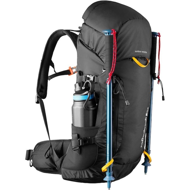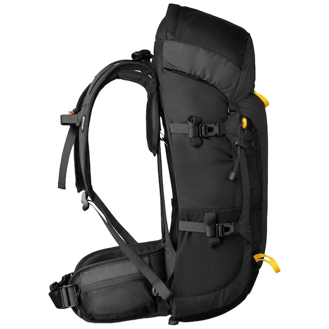 Favorita dos viajantes experientes, possui diversos bolsos, um principal com fechamento em cordão e tampa ajustáveis, um com zíper na parte superior da tampa, um bolso frontal com zíper no lado direito para guardar pequenos objetos e outro bolso frontal com zíper no lado esquerdo, indicado com puxador amarelo. Ainda dois bolsos laterais em malha mesh para garrafa, alças de fixação para bastão de caminhada e pontos de amarração para prender sobrecargas.