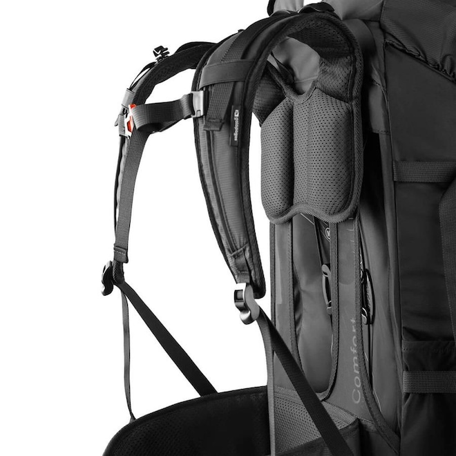 Conforto e segurança também são características da peça, já que possui sistema de distribuição de altura ajustável, com ilustração indicativa de tamanho com engate rápido,também uma barrigueira com dois bolsos para guardar pequenos objetos, reduzindo o peso dos ombros.
