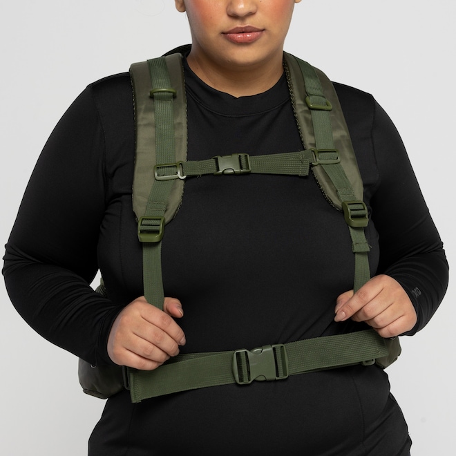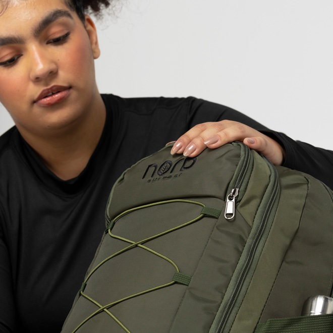 O painel traseiro possui detalhes acolchoados em mesh para respirabilidade com alças integradas e reguláveis, tira peitoral e cinto regulável que ajudam a manter a cargueira Nord mais centralizada junto ao corpo.