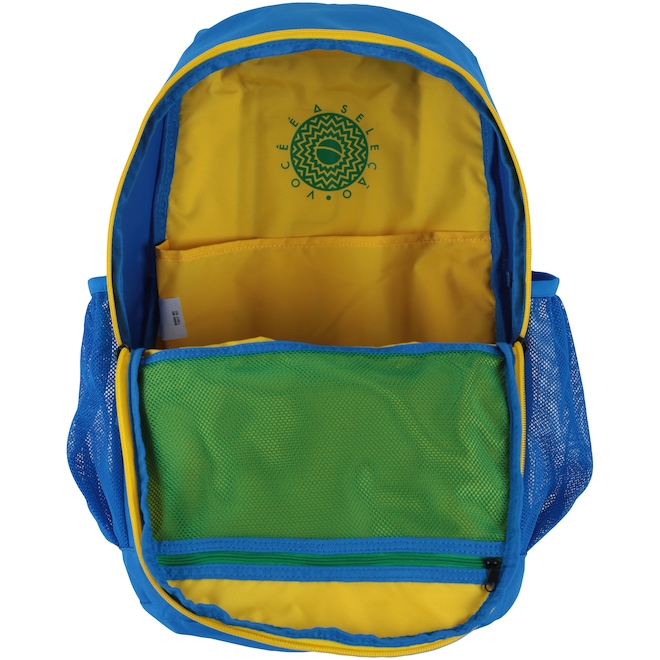 Com as cores da Seleção estampadas em todos os detalhes dessa Mochila Nike, o torcedor e admirador da Verde-Amarela pode transportar seus pertences com conforto e praticidade. Desenvolvida em poliéster resistente, a Mochila da Seleção Brasileira 2018 possui compartimento principal amplo com divisória e bolso em mesh para uma melhor visualização dos itens. Conta ainda com bolso frontal e duas divisórias laterais para o transporte de “squeezes”. O painel traseiro é acolchoado e personalizado com alças traseiras e tira estabilizadora peitoral que permite centralizar a mochila junto ao corpo para comodidade e estabilidade nos percursos.