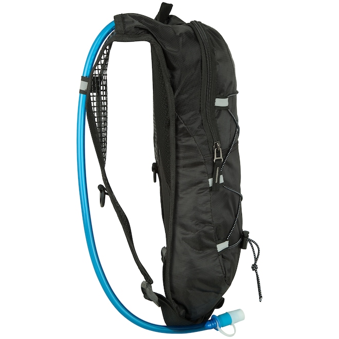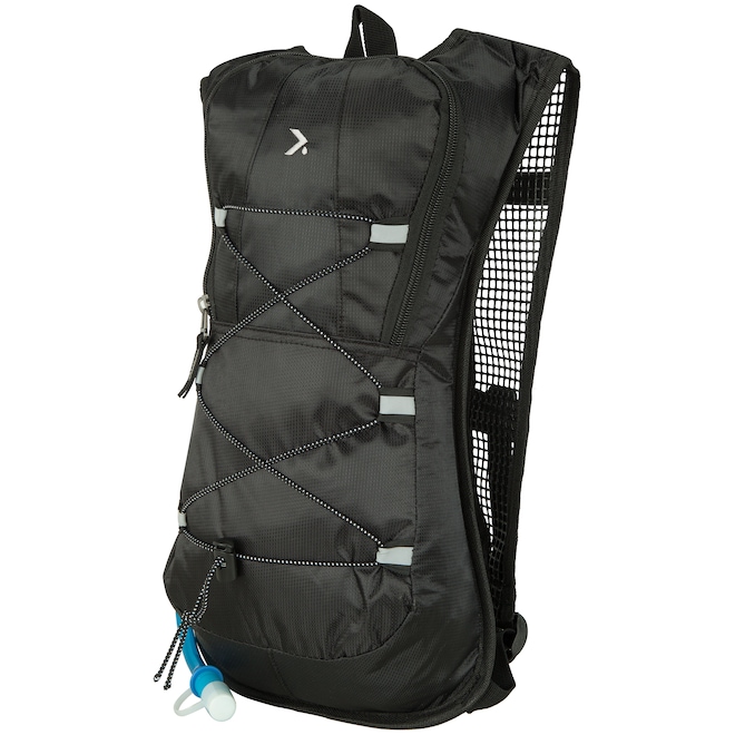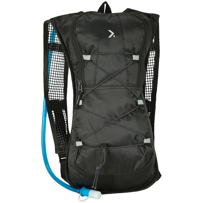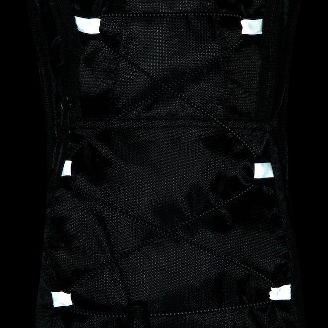 Seu compartimento principal apresenta divisória para reservatório de água 2L com mangueira removível e bico de saída de água por mordedura. O painel traseiro da mochila de hidratação possui detalhes acolchoados em mesh (malha em tramas abertas) com alças integradas reguláveis e anéis em “D” para pendurar objetos. Prática, essa mochila com reservatório de água possui cordão elástico regulável no painel frontal para o transporte de vestuário, puxador alongado em tecido que facilita o manuseio do zíper, além de fitas refletivas que aumentam a visibilidade e segurança do esportista em locais de pouca iluminação.