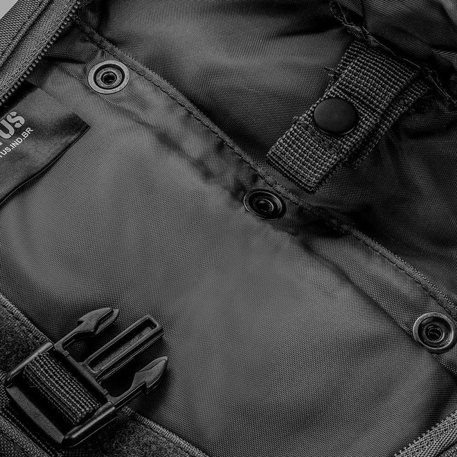 Tem bolso frontal e conta com sistema MOLLE que possibilita o usuário personalizar o uso e acomodar equipamentos.