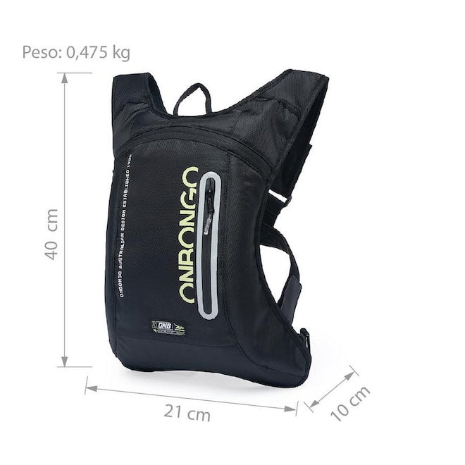 Ficha Técnica: - Marca: Onbongo - Material: 100% Poliéster - Medição (A*L*P): 40*21*10 - Peso: 0.4 - Capacidade da mochila: 8L - SKU: OB0005Z Características do produto: - Compartimento principal com amplo espaço interno e revestimento térmico para a bolsa d?água que comporta 2 litros. - Compartimento frontal menor para pequenos objetos e documentos pessoais. - Possui mangueira de bico compreensão na alça - Alças reguláveis e reforçadas - Fecho com trava peitoral para maior segurança e resistência da bolsa - Fechamento em zíper - Logo, detalhes e zíper personalizados - Mochila autêntica, resistente e original Sobre a marca: - A Onbongo é uma marca 100% brasileira com mais de três décadas de sucesso e comprometimento reconhecida por sua extensa linha de produtos com estilo diferenciado, criatividade e alta qualidade. Temos como foco manter esse estilo em nossos produtos através de pesquisas contínuas sobre desenvolvimento, novas técnicas, estilo, novos materiais e tendências, buscando sempre surpreender os nossos consumidores e atender suas necessidades e desejos por novidade! Cuidados de conservação: Evite carregar excesso de peso Embalar objetos com cantos vivos cortantes Para limpeza, utilize apenas pano úmido ou esponja macia e sabão neutro Não utilizar nenhum produto químico para limpeza Conservar em local seco e arejado Mochila de Hidratação é indicada para esportes de longos percursos, sendo um acessório indispensável para atletas de ponta, que desejam melhorar a performance durante a prática de atividades físicas. Ideal para ciclismo, trilhas, caminhadas, possui refil de água. *** 90 dias de garantia contra defeitos de fábrica***
