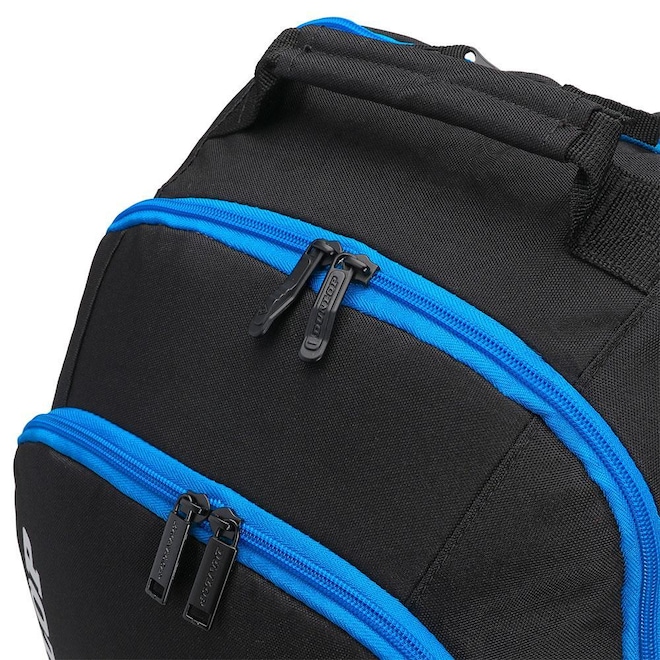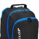 - Detalhamento: Contém três compartimentos, um compartimento para comportar até uma raquete sem capa, no compartimento do meio possui um amplo espaço sem divisórias, e no compartimento frontal temos divisórias internas para melhor organização de seus pertences, possui dois bolsos nas laterais, escrita Dunlop na parte frontal verticalmente e nas alças, alças ajustáveis e colchoadas