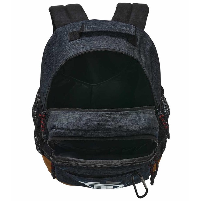 Coleção confeccionada em poliéster reciclado e base em suede. Painel frontal com etiqueta emborrachada com logo em baixo relevo, fita de gorgorão com impressão em silk para segurar skate. Bolso frontal com logo impresso em silk oil e mosquetão preto com logo gravado. Puxadores de zíper em corda com ponteira emborrachada. Tela com espuma e bordado personalizado no painel traseiro. Etiqueta de tecido costurada na alça.
