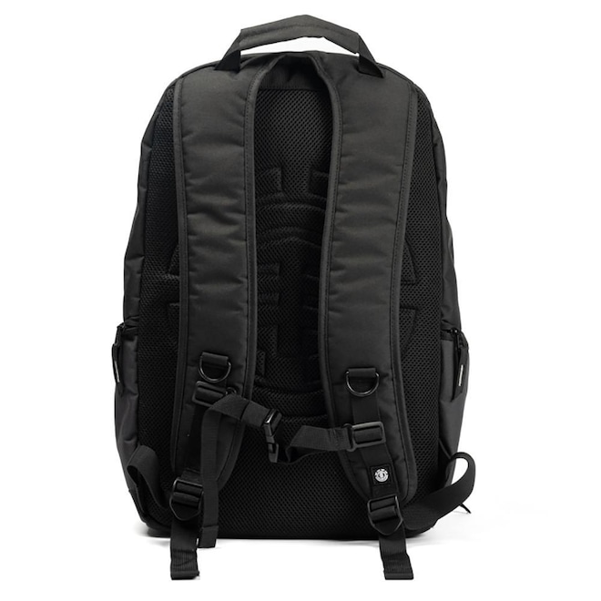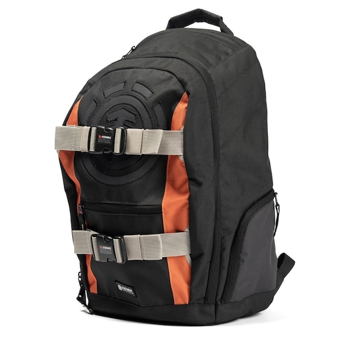 Mochila Element com 1 compartimento principal, 1 frontal, 2 bolsos laterais com zíper, 1 bolso superior para óculos de sol e 1 bolso acolchoado para laptop com fita dupla aderente. Alças de skate dianterias removíveis, logotipo da árvore em relevo frontal, forro e revestimento externo de poliéster reciclado e etiquetas personalizadas.