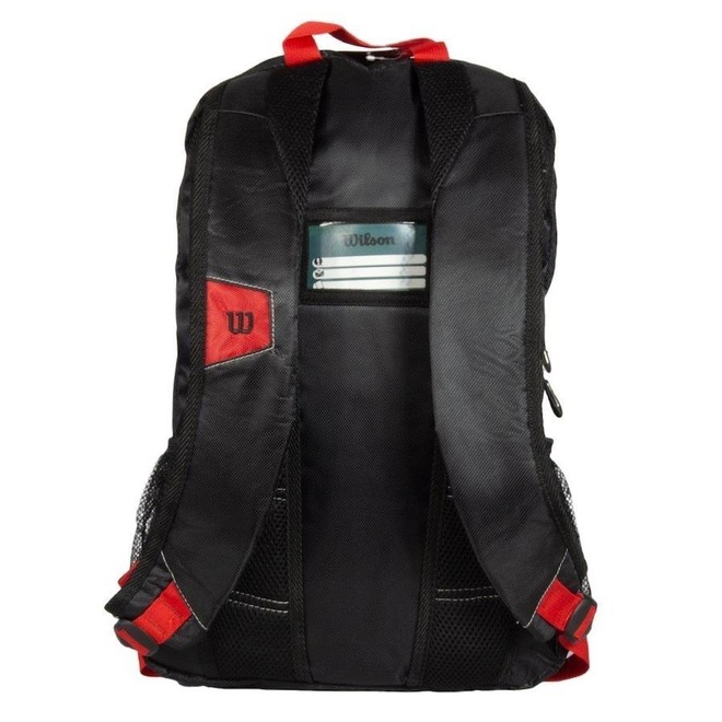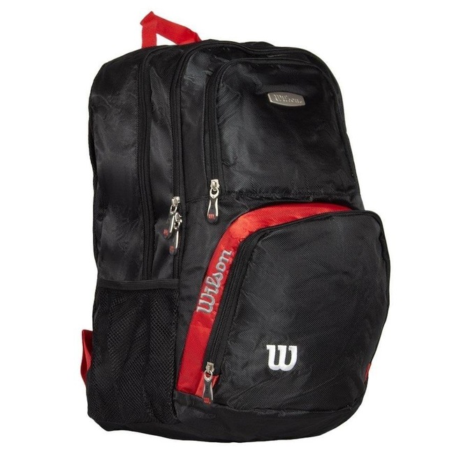 Logo e marca Wilson estampada na parte frontal da mochila, bolsos laterais em mesh, regulagem lateral de profundidade.