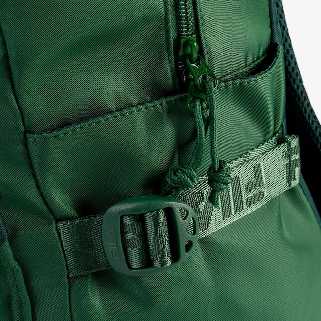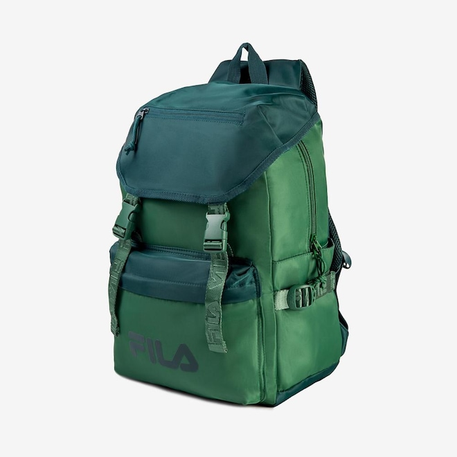 Mochila confeccionada em poliéster com forro personalizado. Apresenta compartimento principal com porta-notebook e fechamento em zíper. Possui lapela contrastante com bolso embutido, fechamento em fita em Jacquard e fivela de engate. Possui bolso frontal com logo FILA estampado com zíper com puxador. Contém bolsos laterais com ajuste, alças com parte interna em airmesh e correia com fivela de ajuste. Dimensões: 30 cm X 44 cm X 16 cm. Capacidade: 21 L.