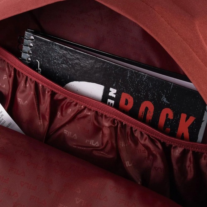 • Painel frontal possui estampa FILA centralizada, bolso inferior com fechamento em zíper e puxador de suede