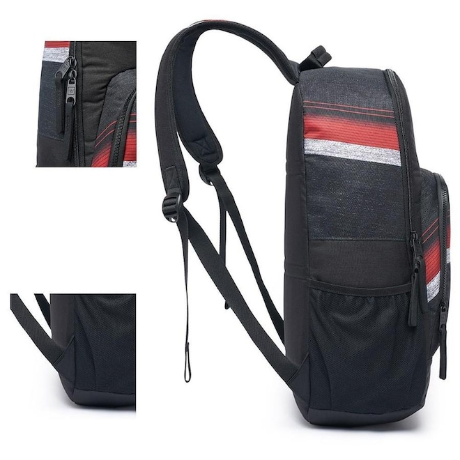 Mochila Hang Loose construída em poliéster 600D texturizado, com bolso principal grande e bolso frontal menor, ambos com fechamentos em zíper, compartimento para notebook até 17", além de contar com uma etiqueta da marca na parte frontal.