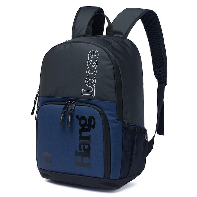 Mochila Hang Loose com compartimento principal, 2 compartimentos frontais, compartimento para notebook até 15.6", estampa frontal, e etiquetas personalizadas.