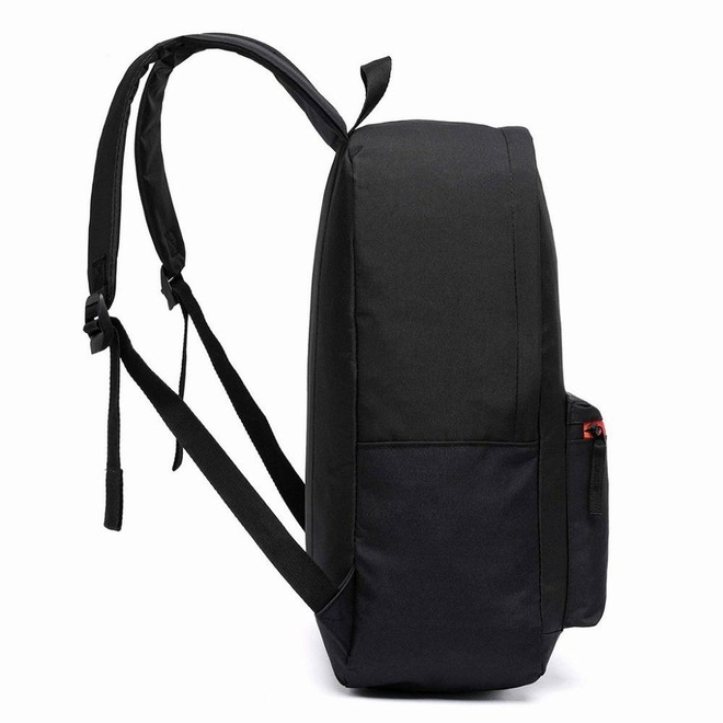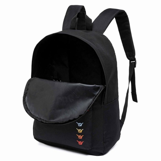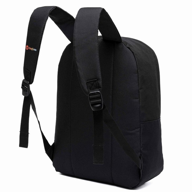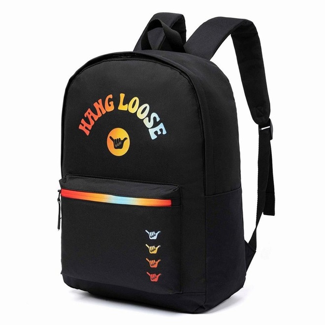 Mochila Hang Loose com compartimento principal, compartimento frontal, estampa centralizada, alças ajustáveis e etiquetas personalizadas.